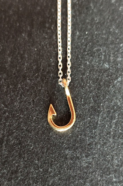 della collezione "t'AMO" di Calcagnini Gioielli. Il realistico amo da pesca è stato realizzato a mano in oro giallo 750, la finitura del metallo è lucida, il gioiello è ben rifinito in ogni sua